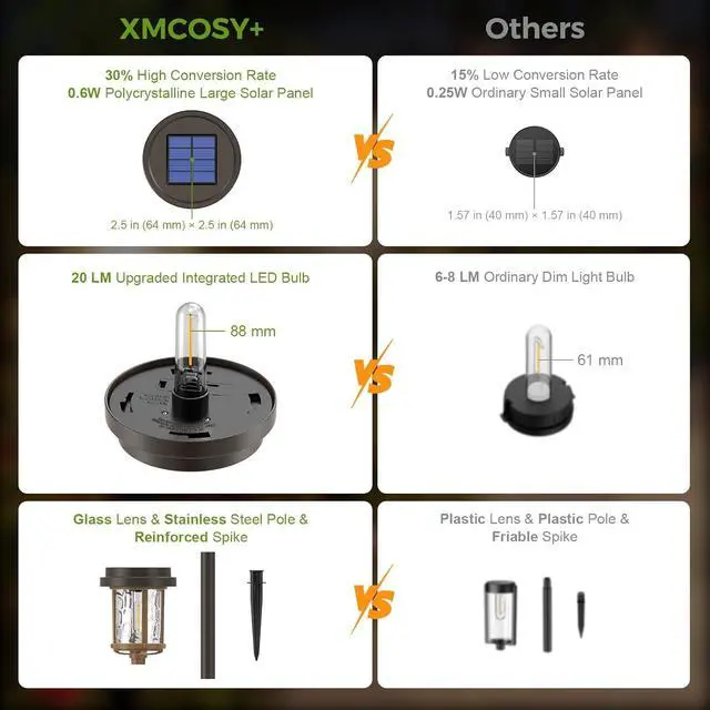 Efficient Solar Panel - 30% Conversion Rate: Solar garden lights with 0.6 W 2 V Polycrystalline solar panel ( 2.51 " * 2.51 " ) up to 30% Conversion Rate. Rechargeable AA 1.2 V 1000 mAh battery can store more energy for all-night illumination.