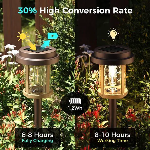 Brightness Vintage Bulb - 20 LM: Solar pathway lights outdoor use upgraded integrated LED with vintage bulb. Outdoor solar lights for yard after charging in 6 - 8 hours under direct sunlight, it can maintain illumination for 8 H (Winter) to 10 H (Summer).