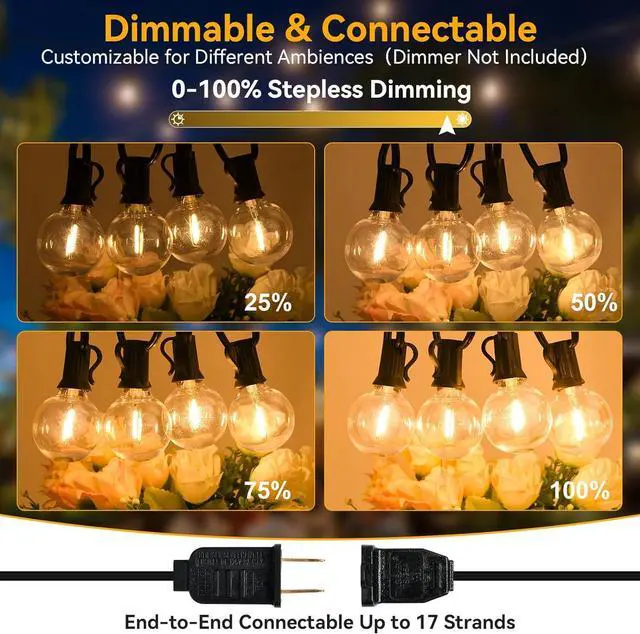 Connectable and Dimmable for Customized LightingYou can adjust the brightness of our patio lights with a dimmer (not included) to create the perfect mood for any occasion. You can also connect up to 17 strings together to cover a larger area or create a stunning display. Even if some bulbs are broken or removed, the rest of the bulbs will stay lit and bright.