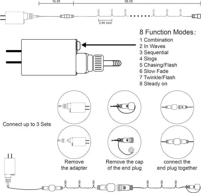 8 Lighting Functions: Our Halloween string lights have 8 lighting modes: combination, in waves, sequential, slogs, chasing/flash, slow fade, twinkle/flash, and steady on. Fit different occasions, moods, feelings, holidays, festivals, anniversaries, etc. Pressing the round button on the transformer to change the lighting modes.