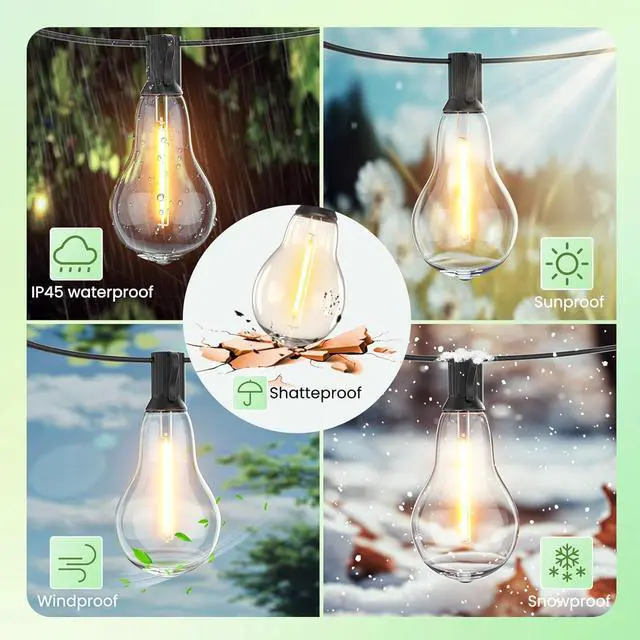 Outside Use: Our outdoor string lights are waterproof, so they can withstand rain, snow, or moisture, the outdoor lights can be hung year-round without fear of weather damage to the yard string lights for outside. Backyard lights outdoor with more safer shatterproof plastic bulbs, even if backyard lights drop down or blow away by the high winds, these string lights not pose a danger to your family