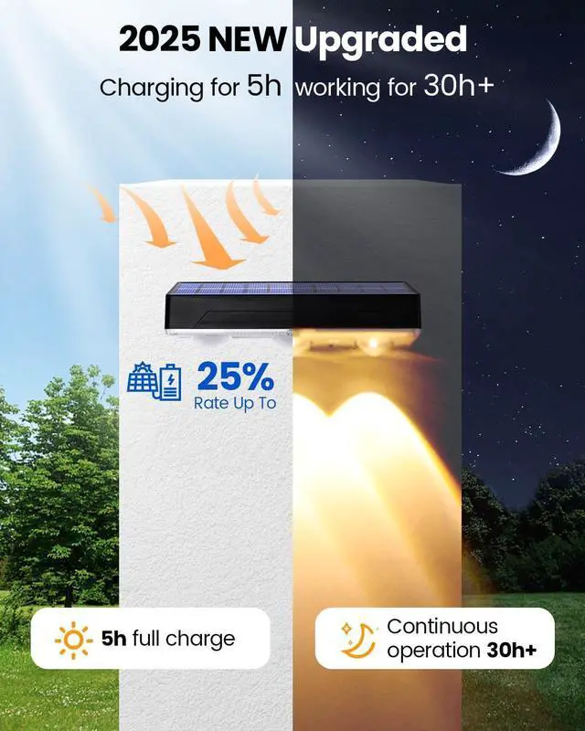 AUTO ON/OFF & EFFICIENT CHARGING Equipped with auto on/off function, the outdoor fence light automatically turns on at dusk and off at dawn. The upgraded charging efficiency is 25% more efficient, it only takes 5 hours of sunlight to fully charge, providing more than 30 hours of continuous operation. Enjoy worry-free, energy-efficient lighting all night long!