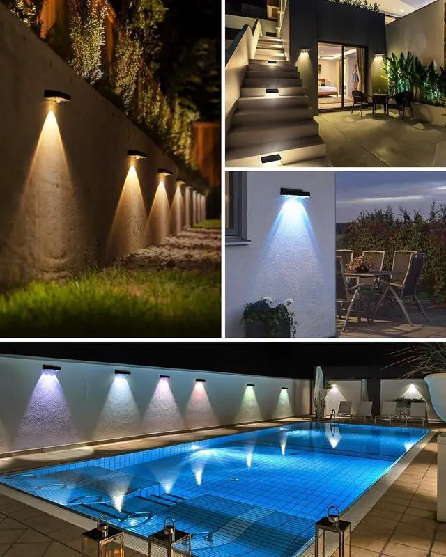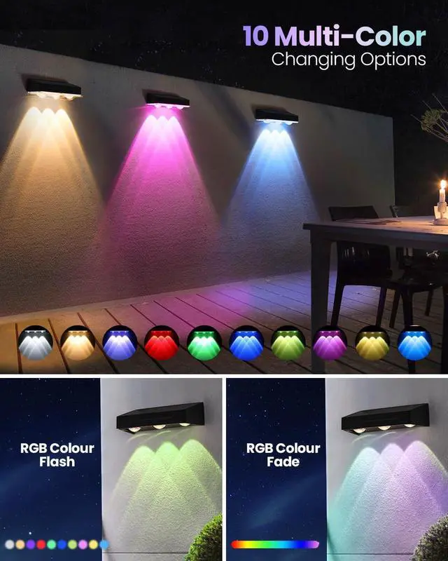 10 Colors + 2 Dynamic ModesSolar fence lights add color to your outdoor space, featuring 10 color lighting modes, warm white, cool white, RGB, mixed white, yellow, purple, orange, cyan, etc., and
