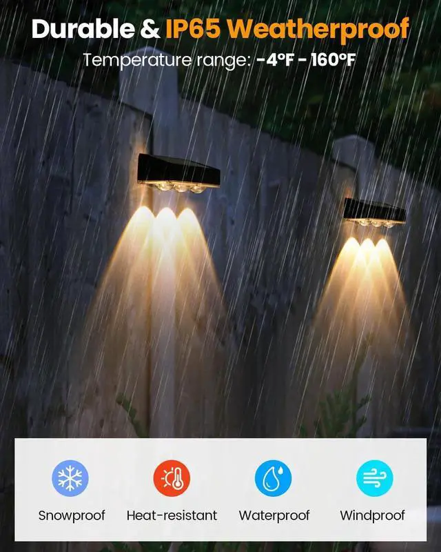 Durable and IP65 WaterproofThese solar fence lights are durable and have an IP65 waterproof rating to resist rain, snow, dust and other harsh weather conditions. The ABS housing is designed for year-round durability to ensure reliable operation in any season