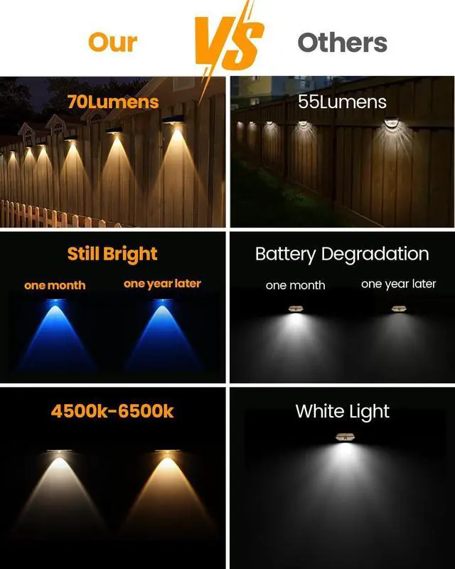 2025 Upgraded Super BrightnessOutdoor solar fence light utilizes the latest LED technology with 3 high transmittance lenses to enhance brightness and add a decorative touch to your outdoor space. The lenses focus the LED light into a concentrated, intense beam that delivers 70 lumens of brightness, easily illuminating your yard, garden or pathway
