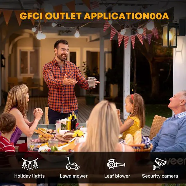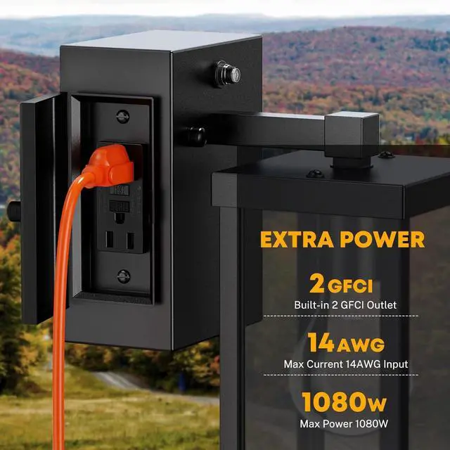 Built-in 2 Outlet: GFCI (ground fault circuit interrupter) outlets bring you the convenience of powering up your outdoor. Easily accessible power with additional protection from power surges/short circuits/other electrical faults. Simply turn on the light and plug in your holiday decor, power tools, etc. 14AWG input wire with max 1080W load.