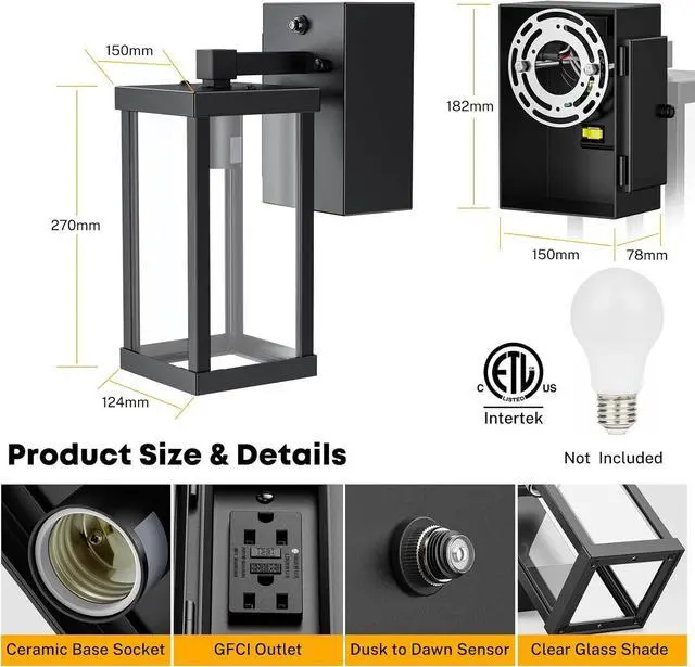 Note: This product Controlled by the highly sensitive IC photocell sensor, this outdoor wall light with outlet will automatically detect the surrounding ambient brightness, appropriately auto-on at night and auto-off in the daytime. No need to fumble the wall switch in the dark or turn it off manually during the day. Humanized design offers the greatest convenience for your everyday life.