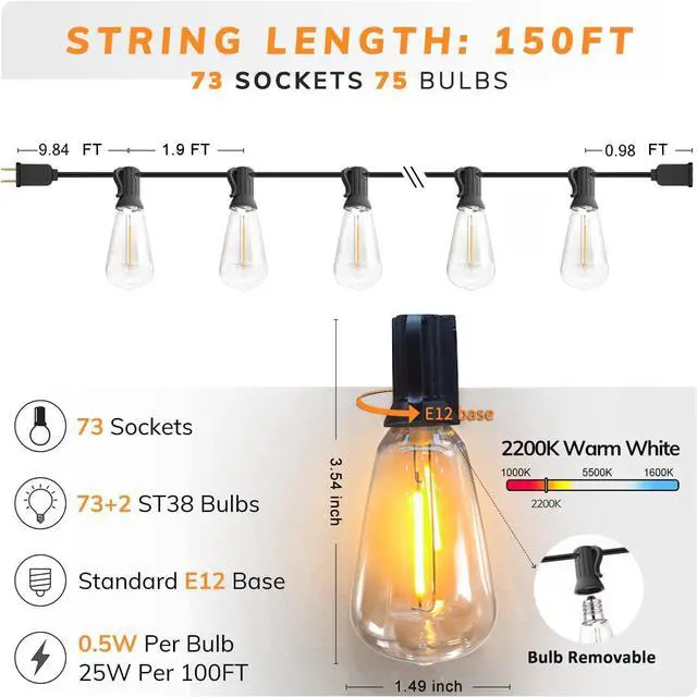 Dimmable Long String Lights: 150FT long String Lights come with 73+3pcs high efficiency 0.5W ST38 edison vintage style LED filament bulbs, which can dramatically reduce electricity bills compared with incandescent bulbs. LED outdoor string lights are compatible with most dimmer at the market. (Tips: Dimmer not included)