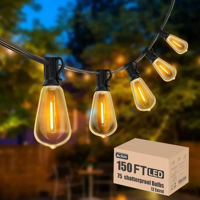 Easy Installation and Connectable Patio Lights: Achin outdoor string Lights 150ft long with 9.8 ft leading wire, 73pcs E12 Sockets and spaced 2ft apar. Patio lights can be connected up to Max 10 strands via end to end plugs, they could lights yours whole patio space. Each socket includes a hanging hook design allows for hang up and installation anywhere. Widely use for wedding, party, Christmas and many other occasions or events.
