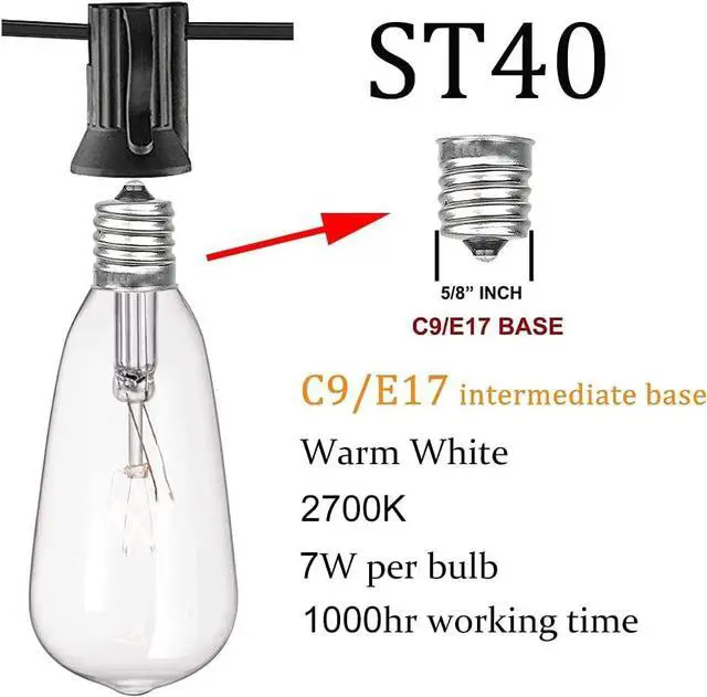 20 feet long outdoor patio string lights with 20 hanging sockect and 22 ST40 clear glass bulbs (2 spare bulbs), C9 or E17 intermediate screw base 7W edison bulbs for outdoor string lights, UL Listed for outdoor & indoor. all edison bulbs are tested over 48 hours before packing.