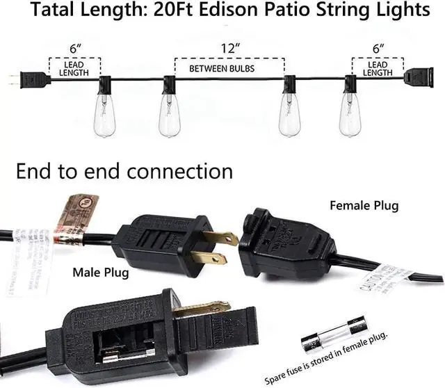 Connectable edison bulbs outdoor string lights: 6" lead with male plug, 12" spacing between bulbs, 6" tail with female connector, total length 20ft outdoor patio string lights designed with end-to-end connected in paralled up to maximum 3 strands vintage patio string lights. If a broken or removed bulbs wont affect the rest bulb.
