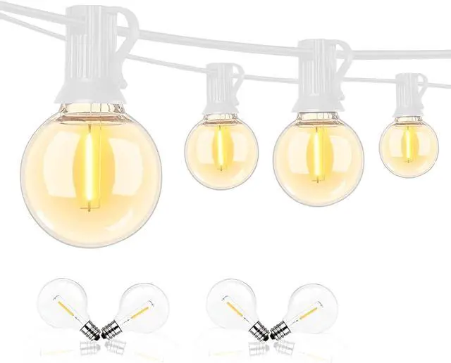 Shatterproof outdoor lights string: LED outdoor hanging lights to consist of 50 hanging outdoor sockets, 50 shatterproof plastic globe led bulbs (2 spare). LED G40 bulbs made of plastic, shatterproof than traditional glass bulb type. Low working temperature, safe for touch.