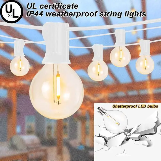 Weatherproof patio lights: C7/E12 candelabra socket base. UL Listed, rating IP44 weatherproof g40 string lights outdoor. Suitable for Indoor&Outdoor Decoration. 2700K warm white lights, commercial great top quality are great for patio, porch, backyard, deck, garden, tents, umbrella, canopy, pergola, overhead deck, festoon lighting, festival celebrations, etc.