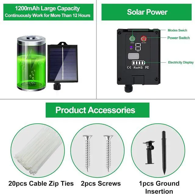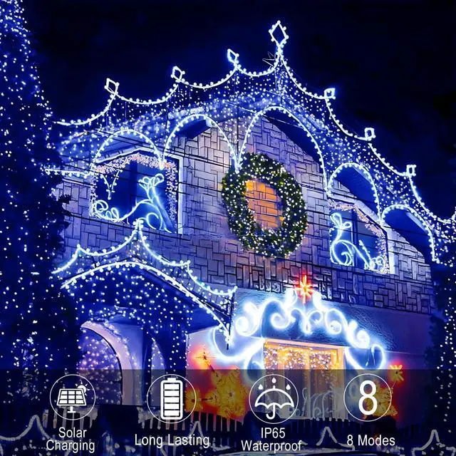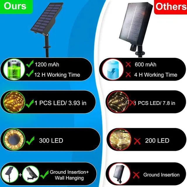 High Battery Capacity & SafeThe solar string lights with 300pcs low-heat-emission LED bulbs, up to 19% high energy conversion rate comparing to others 13%. The solar fairy lights can work continuously for more than 12 hours at night if the panel absorbs enough sunshine during day. Meanwhile the fairy string lights is environmental friendly and energy efficient. The lights will not overheat after using many hours, so they are durable and safe to use.
