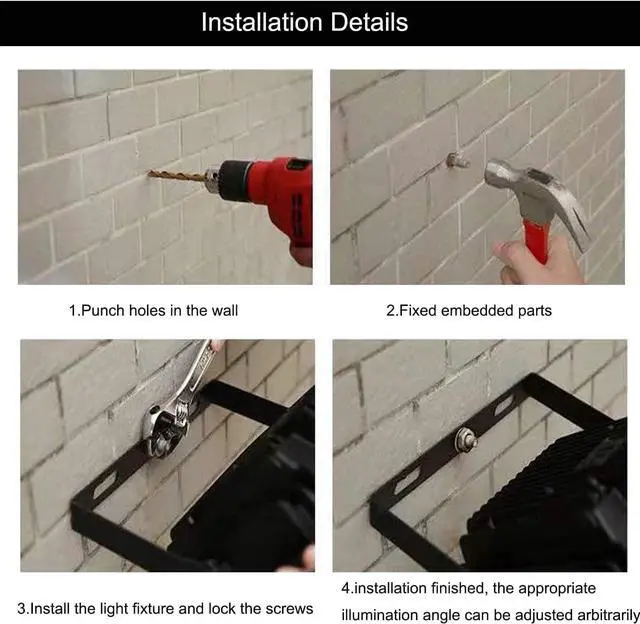 Stable & Easy to InstallCome with UL listed US plug and a over 6ft cord, this security spotlight can also be mounted on a tripod as a work light. A widened and thickened metal bracket makes the flood lights more stable. The adjustable bracket, which is easy & flexible to adjust to a different angle as your requirement, helps to install the light with any angle you required.