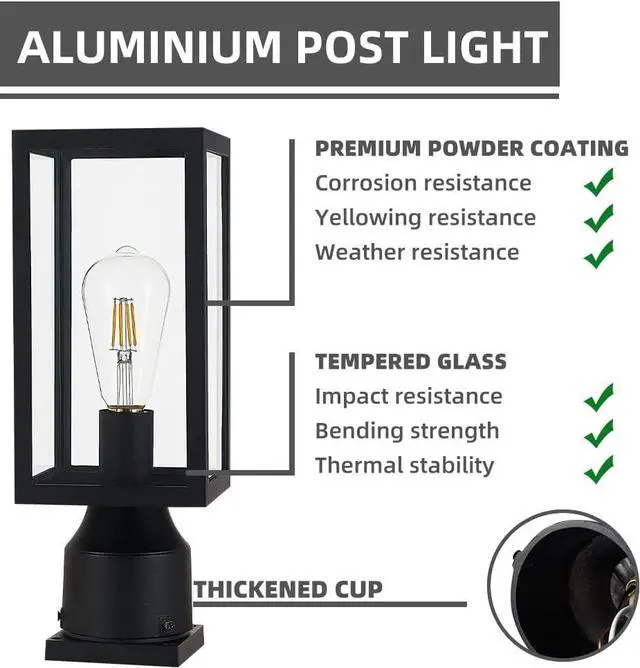 Outdoor post light is made of aluminum and clear tempered glass. In addition to rust prevention, high-quality powder coating has corrosion resistance, yellowing resistance and weather resistance. Higher strength tempered glass has impact resistance and thermal stability, it can withstand harsh weather considerations