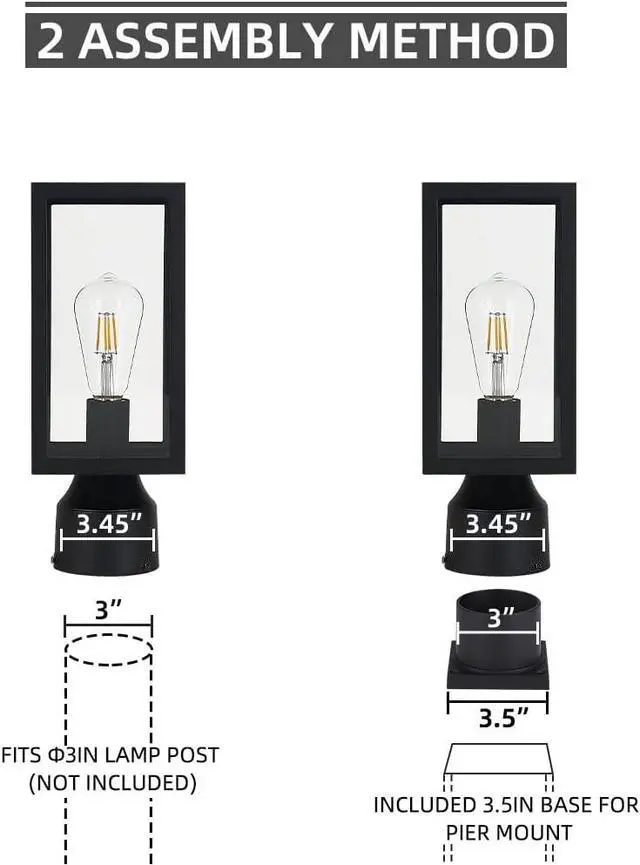 The size of the post light outdoor is 5.23 " (W) by 5.23 " (L) by 13.8 " (H). The side length of pier mount base is 3.5 " by 3.5 ", available for post pole mount and pier mount. Pole light suitable for outdoor locations (wet locations), such as garden, yard, patio, balcony, porch, passage or entrance etc