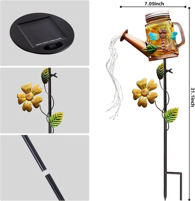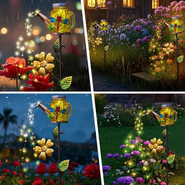 Outdoor Solar Watering Can: This garden lights solar powered decor is a unique and nice decoration for the garden, which realistically mimics the effect of flowing water. Solar garden decorations look like little star shower lights at night. Yard decorations adopts premium punched iron sheet with hollow designation, increasing luminous beauty.