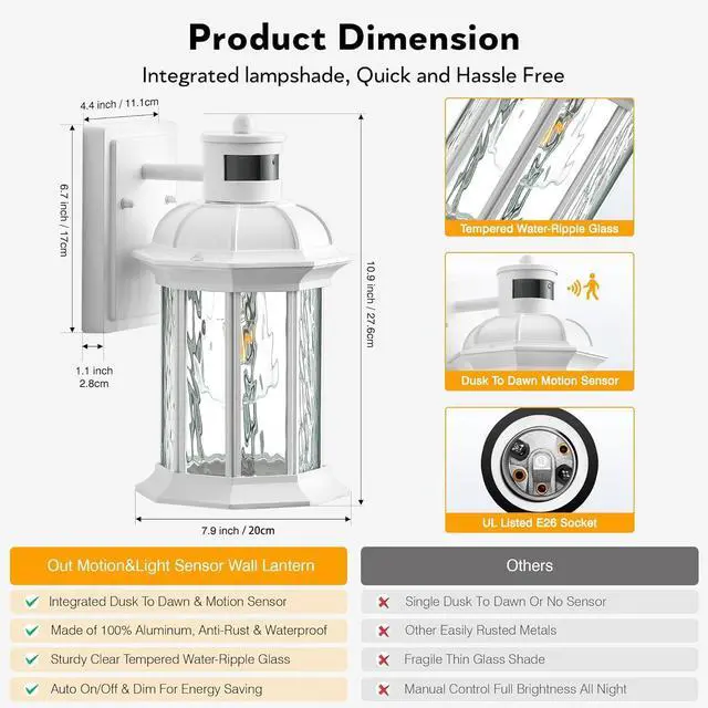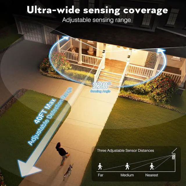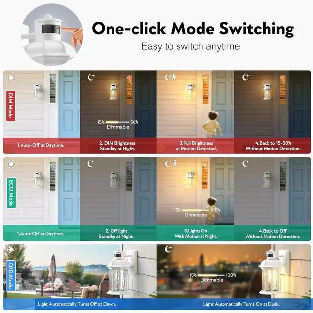 Motion Sensor & Dusk To Dawn SensorOur outdoor wall lights are integrated with advanced PIR technology & photocell sensors. It will auto-on at sunset with 30% Dim Light, activated with 100% high light once motion is detected, and revert to 30% brightness ( or full off) after 2 minutes without movement. And will auto-off at dawn. Whats more, a precisely wide range of motion sensor 40ft distance, 220 degrees, free your hands with intelligent sensors tech and effectively save energy.