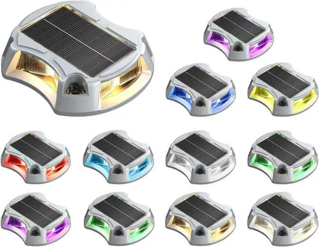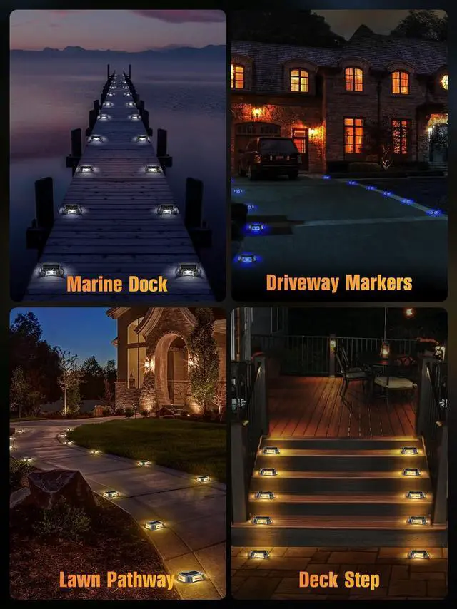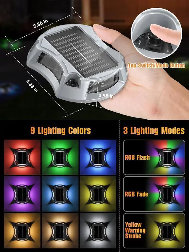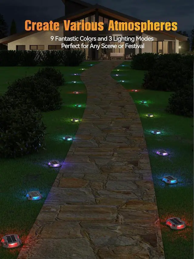 9 Lighting Colors & 3 Modes Illuminate your space with our solar driveway lights, which offer a warm and inviting lighting experience. With 9 rich color options and 3 versatile lighting modes, you can easily create a beautiful atmosphere for everyday use or special occasions. These solar dock lights serve multiple purposes as both warning and guiding lights, as well as decorative accents for your home, making them perfect for outdoor use in driveway, deck, dock, pathway, etc