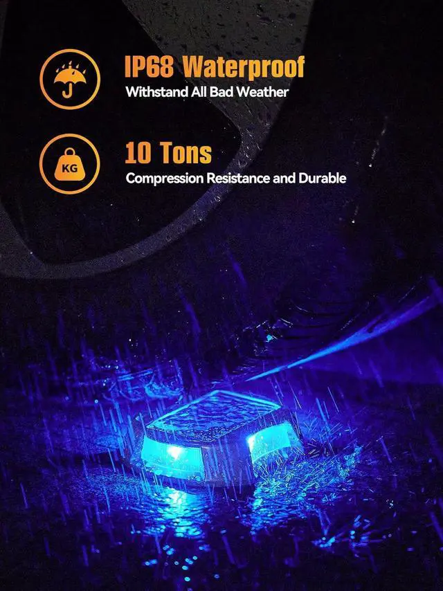 IP68 Waterproof & Pressure Resistant Engineered to withstand the elements, our driveway lights solar powered boast an IP68 waterproof rating, making them fully submersible and able to function properly even during heavy rain or storms. The premium sealed aluminum alloy housing resists rust and offers impressive pressure resistance, capable of supporting the weight of most vehicles, trucks, and boatsmaking them ideal solar dock lights outdoor waterproof