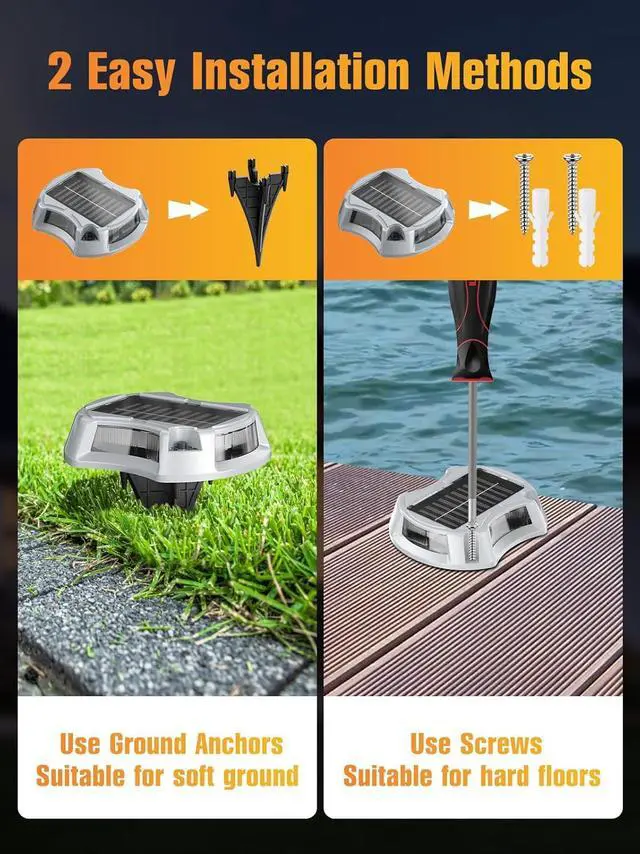 2 Easy Installation Methods Enjoy hassle-free installation with no wiring required! Our solar lights for dock can be installed anywhere that receives sunlight. Choose between two installation methodsscrews or ground anchorsto suit your needs. Easily place these driveway dock lights in lawns, flowerbeds, or along pathways with ground anchors, or use screws to mount them on hard surfaces like walkways, concrete driveways, pavers, steps, sidewalks, and wooden decks