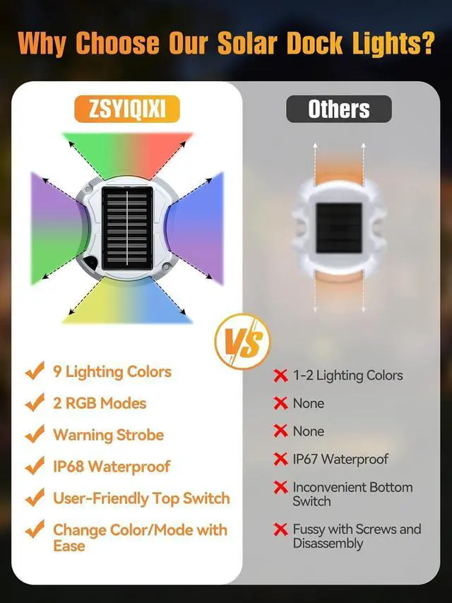User-Friendly Top Switch Design & One-Button Operation Our innovative solar dock lights marine feature a unique top button that combines both the switch and mode selection into one easy-to-access location, allowing you to change colors and modes with ease. Effortlessly switch between a cozy warm glow for a relaxed evening or vibrant colors for a festive gathering with our dock lights solar powered waterproof. Theres no need to fuss with screws or disassembly