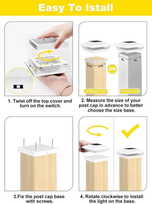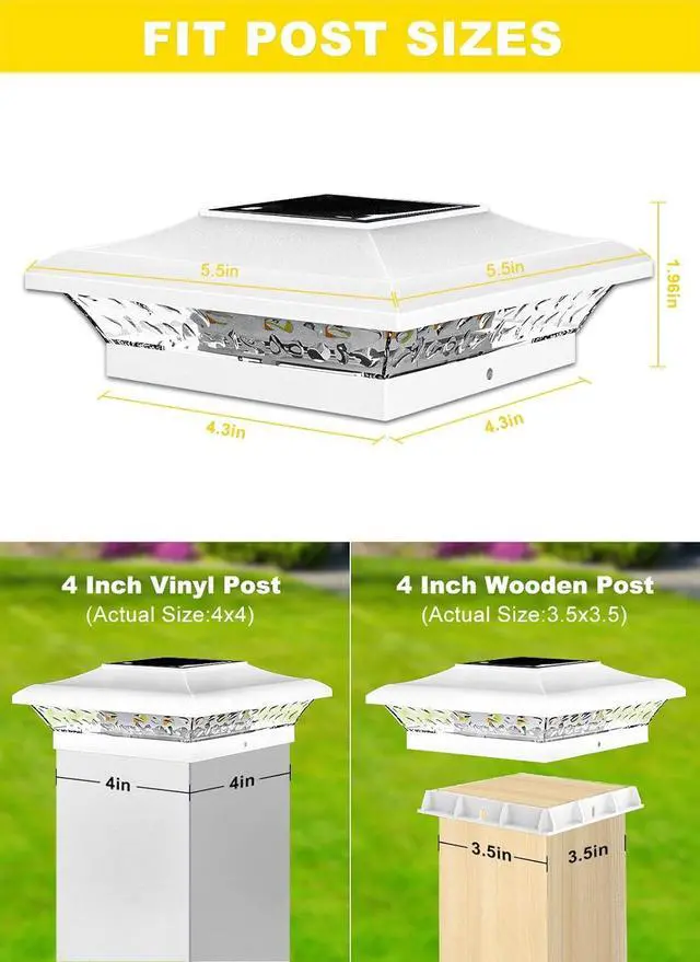 For 4x4 wooden posts-actual size: 3.5 x 3.5 ", actual size of our product' s base: 3.6 x 3.6 ". For 4x4 vinyl posts (Remove the inner 3.5 x 3.5 " base first), actual size of our product' s base: 4.1 x 4.1 ". Measure your post caps beforehand for seamless installation on fences, decks, gates, or mailboxes no electrician needed!