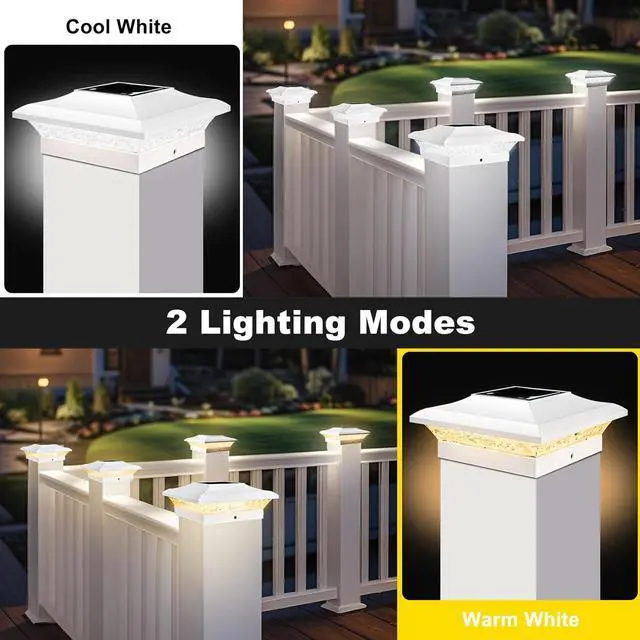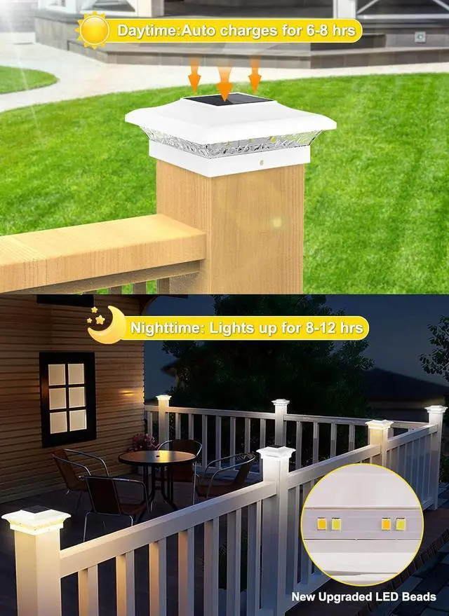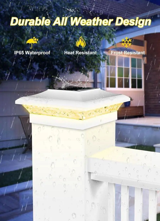 [IP65 Waterproof Built for Rain, Snow & Extreme Weather] 4x4 vinyl fence post solar lights have been upgraded with IP65 waterproof seals and heavy-duty PP plastic, built tougher than standard lights! These outdoor solar post lights laugh off rain, snow, and extreme temps. Safeguard your vinyl fences, wooden decks, or garden pillarsrust-free and crack-resistant for years of reliable glow.