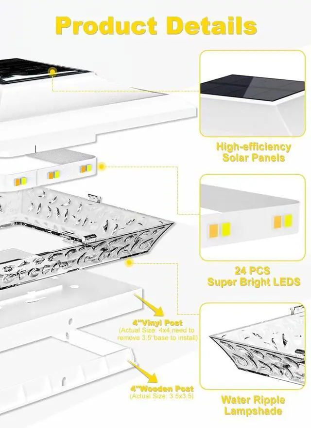 [12-Pack Value + 2-Year Warranty Risk-Free Purchase]Each order includes: 12pack Solar Post Cap Lights, Mounting hardware (screws & sleeves)ED reflector & instruction manual. Backed by T-SUNs 2-Year Warranty and 24/7 U. S. Support, buy with confidence!
