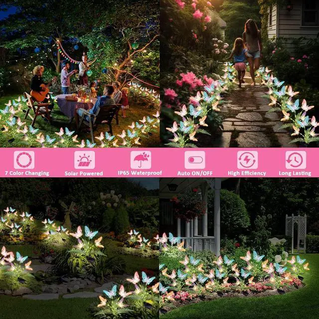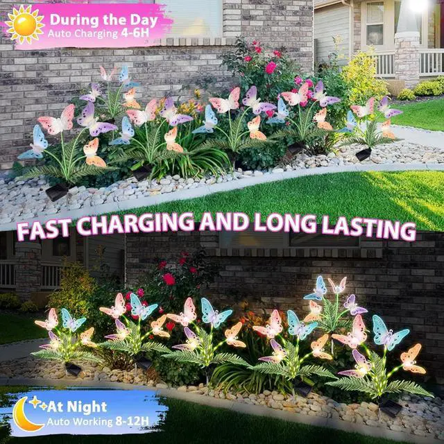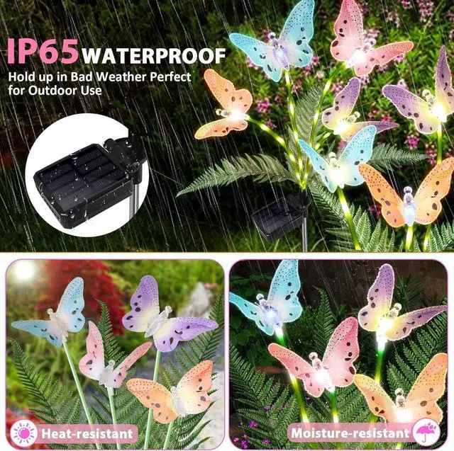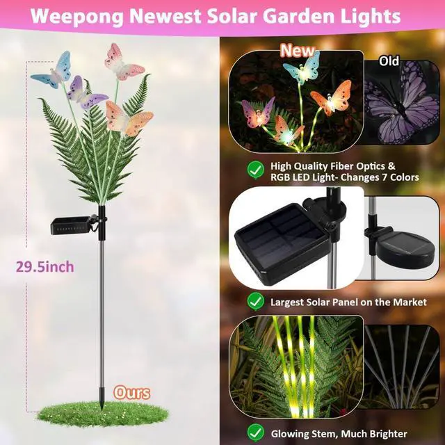 PACK BUTTERFLY SOLAR YARD LIGHTS: Weepong Solar garden lights outdoor with RGB 7-colors changing and great light transparency. The Butterflies are made of high quality fiber optics and exquisitely designed to imitate real butterflies. This product looks like a swarm of butterflies flying around in your garden, adding a charming and eye-catching element to your outdoor decorative, great addition to garden and yard