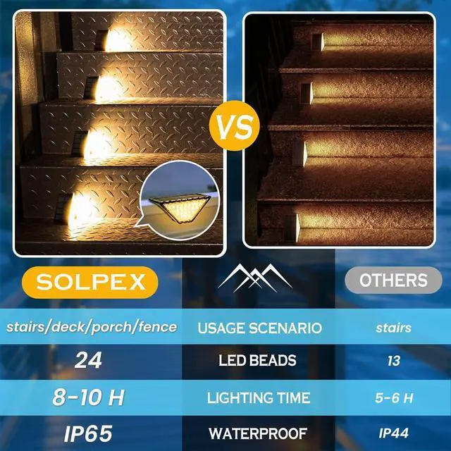 Multiple Usage ScenariosUnique design combines the advantages of solar step lights and solar deck lights, which suitable for stair, step, deck, fence, front proch, garden, patio, yard decor