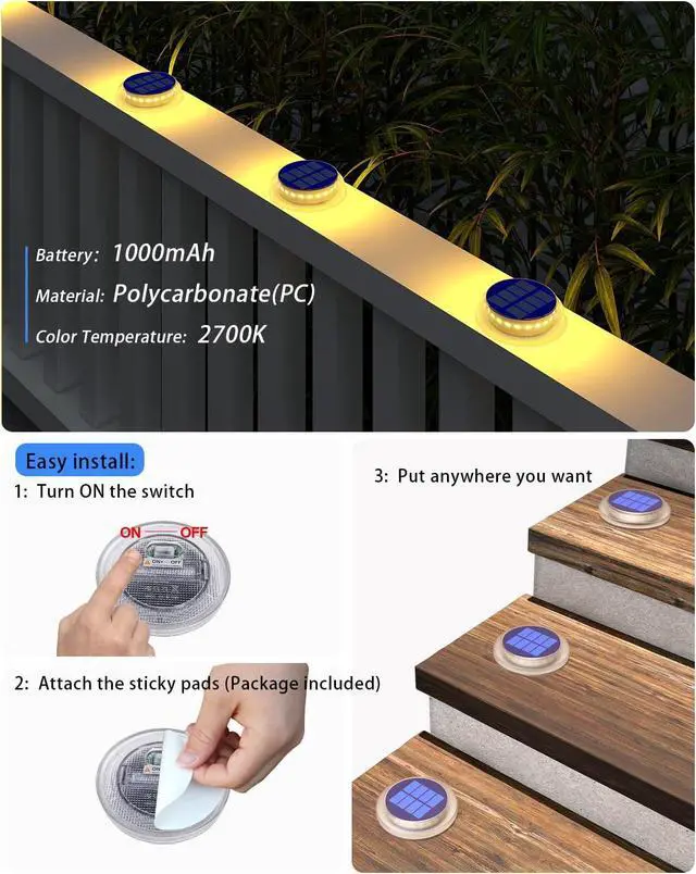 100% Satisfaction ServiceThe solar step lights package includes 4*disc lights + 4* adhesive pads, you can attach it to the flat surface with the sticky pads or placed directly in any " I wish there was a light here" location. We provide 24-hours online after-sales service, please contact us via order mesage if you need.