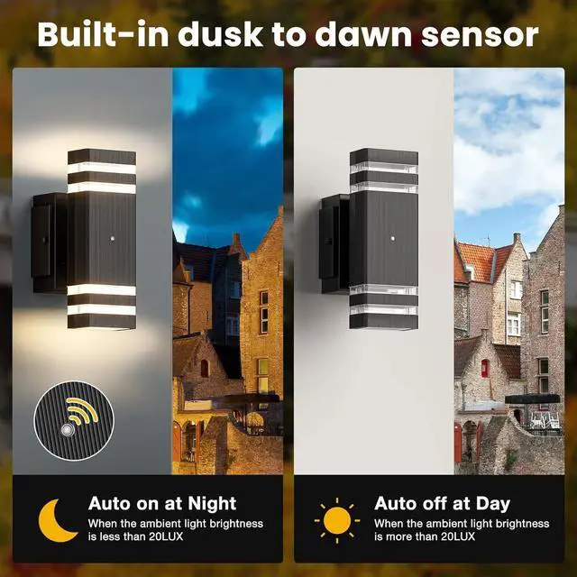 100% Aluminum Anti-rust & Waterproof: Our outdoor up and down porch light was made of heavy-duty die-cast aluminum alloy, these outdoor wall lights are waterproof, anti-rust, anti-corrosion, and seamless connection. Waterproof rating of IP65. No matter rain or snow, ultra-high or low temperatures, this dusk to dawn outdoor lighting can still keep stylish looking after years of use, no worries about the aging problem.