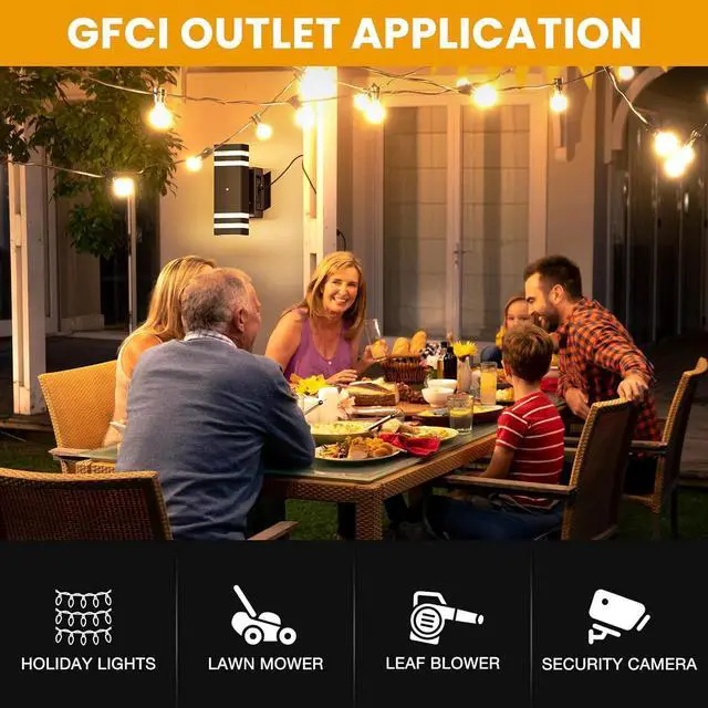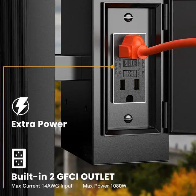 Outlet: GFCI (ground fault circuit interrupter) outlets bring you the convenience of powering up your outdoor. Easily accessible power with additional protection from power surges/short circuits/other electrical faults. Simply turn on the light and plug in your holiday decor, power tools, etc. 14AWG input wire with max 1080W load.