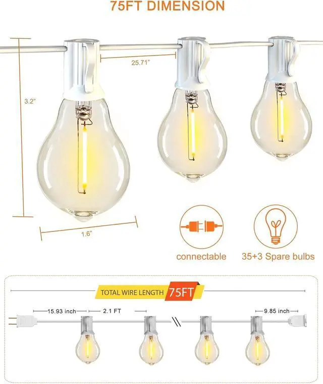 Energy Efficient and safeOutdoor string lights sets include bulbs and light strings, with classic LED edison bulbs cast a vintage glow like incandescent filaments, yet use up to 80% less power than incandescent bulbs. With an average lifespan of 30, 000 hours, they outlive incandescents too. Patio lights are end-to-end linkable, connect up to25 strands of 75FT white cord, Easily light up a backyard party or camping wedding. Removable bulbs mean can use the stringer for lighting in other seasons.
