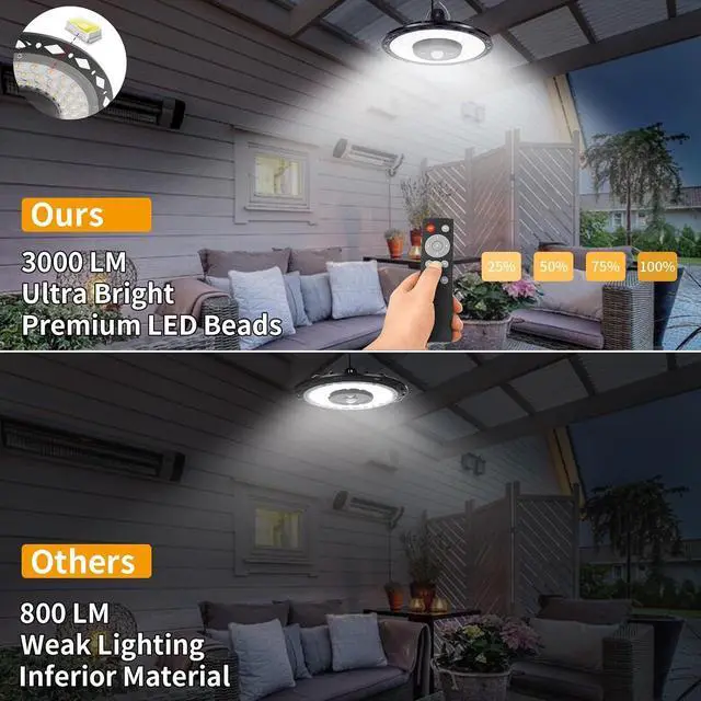 3 CCT Options & 2 Timers: 3 color temperature(3000K/4000K/6500K) available in the same lamp, whenever you want to change, just press the CCT button on remote control. Also features timer(4H/6H) and adjustable brightness, the gazebo lights solar can be set to suit different occasions and moods.
