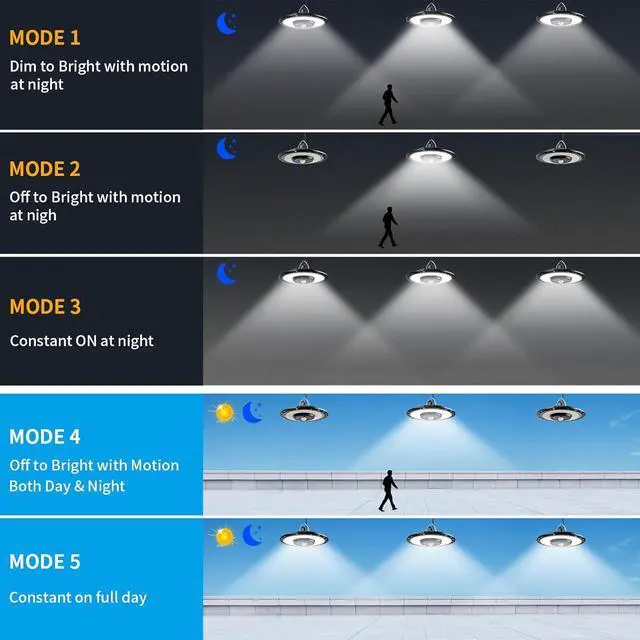 Mode 5: The light will stay on no matter day or night. Whether you need a sensing light in the entry or require a constant light in your off-grid spot, the multiple lighting modes provide the perfect illumination.
