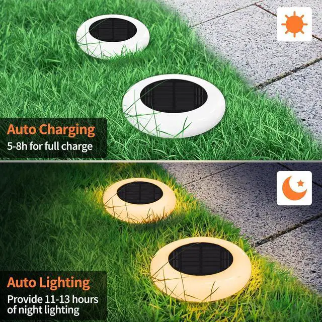 Solar Powered and Energy Saving Solar Pathway Lights: After about 8 hours of direct sunlight, the solar outdoor lights can be fully charged and automatically light up when night falls. The larger solar panel and built-in rechargeable battery make the solar lights work for about 11-13 hours.