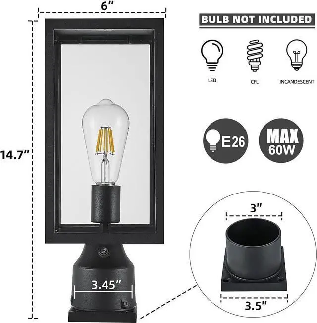 The size of the post light outdoor is 6" (W) by 6" (L) by 14.7 " (H). The side length of pier mount base is 3.5 " by 3.5 ", available for post pole mount and pier mount. Pole light suitable for outdoor locations (wet locations), such as garden, yard, patio, balcony, porch, passage or entrance etc