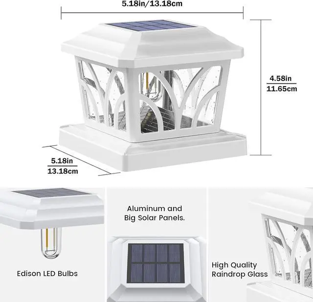 [Edison LED Bulb] Our solar post cap light features a long-lasting Edison LED bulb, encased in robust aluminum with raindrop-tempered glass. This cap light automatically powers on at dusk and switches off come dawn. Emitting a brightness of 20 lumens, it promises up to 12 hours of consistent illumination for your post when fully charged.