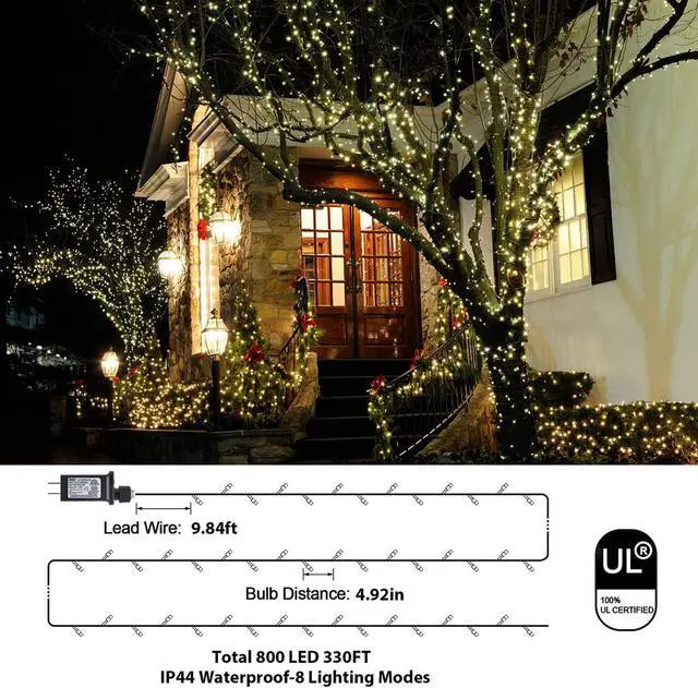 Super Long Christmas LightsSwitch on the festivities with this 800LED Christmas string light which has 330ft long wire + extra 10ft lead length, long enough to reach all around the garden, drape through shrubs and along fences, or frame your front door to welcome guests with this twinkling display.