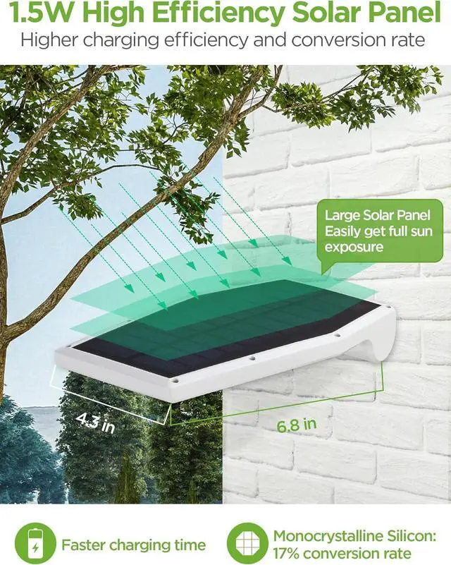 Upgraded Solar Panel: The large solar panel measures 4.3 * 5.7 inches in width and length, allowing faster charging in less sunshine. The panel uses premium monocrystalline silicon material to achieve a 17% photoelectric conversion rate higher than ordinary solar lights, high efficiency, and energy saving.