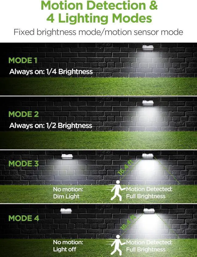 Optional Working Modes: 1/4 Brightness Light; 1/2 Brightness Light; Dim Light+ Motion Sensor Full Brightness Light; Off + Motion Sensor Full Brightness Light. The intelligent motion sensor can detect a movement distance of up to 16.4 feet.