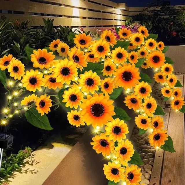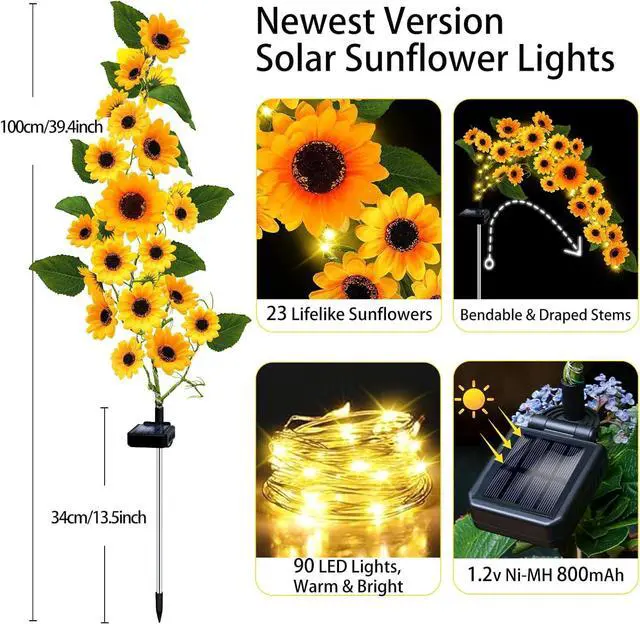 Unique Solar Sunflowers: This set includes 2 pack sunflower solar lights outdoor waterproof with 23 vibrant sunflowers and leaves, along with 90 bright warm white LED bulbs. The lifelike design adds a touch of beauty to your outdoor space