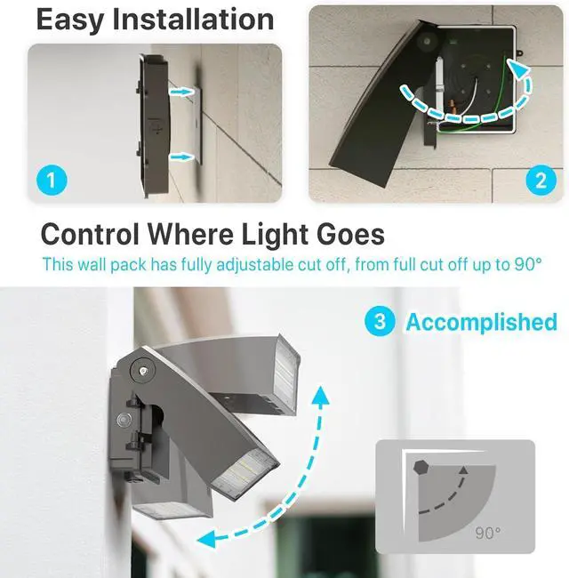EASY INSTALLATION & ADJUSTABLE DESIGN - Quick one-person installation in 15 minutes, full cut off led wall pack uses 0-90 degree adjustable light head and full cut-off design to control the lighting, which can be easily and accurately adjusted on site to aim at the desired lighting direction without worrying about light pollution or annoy the neighbors.