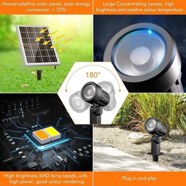 Energy Saving and Large Battery Capacity: During the day, the solar panels will charge automatically, and at night, the spotlights automatically turn on. Our solar spotlights have update batteries to 6000mAH larger capacity.