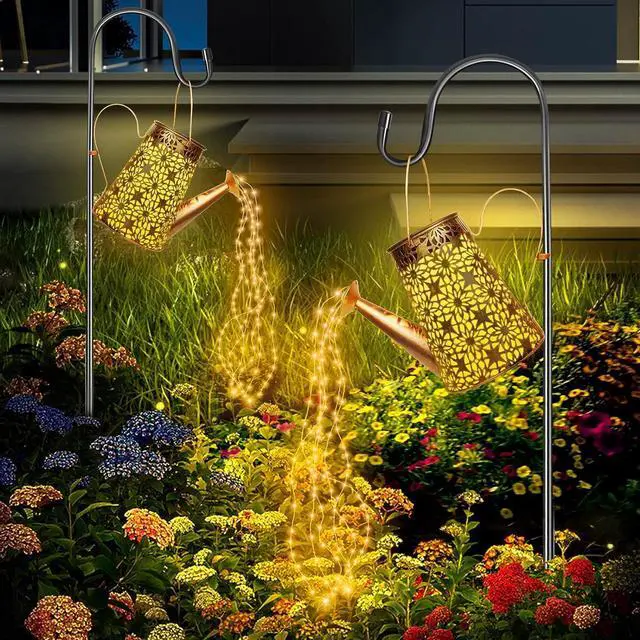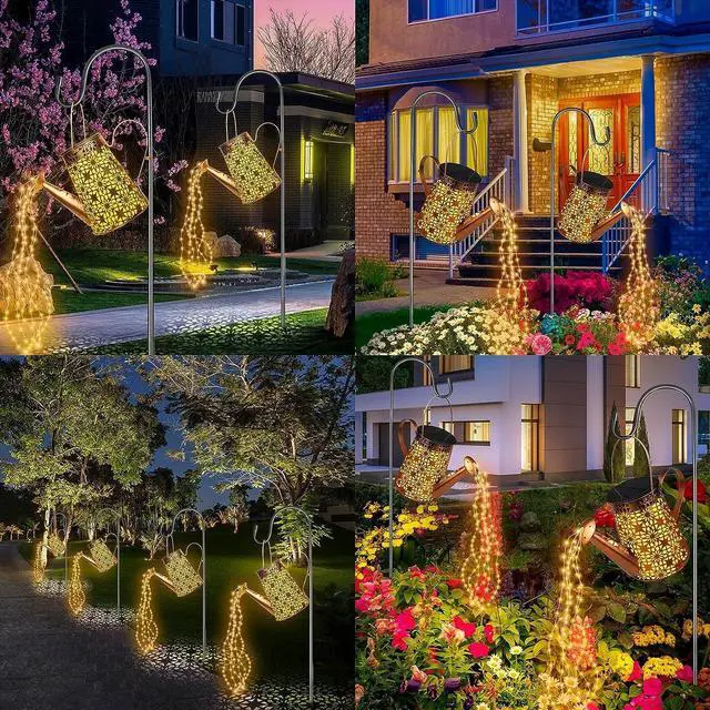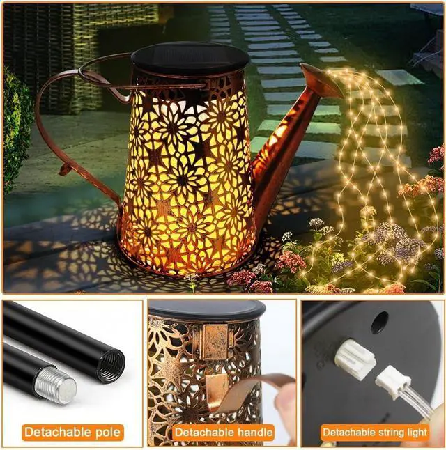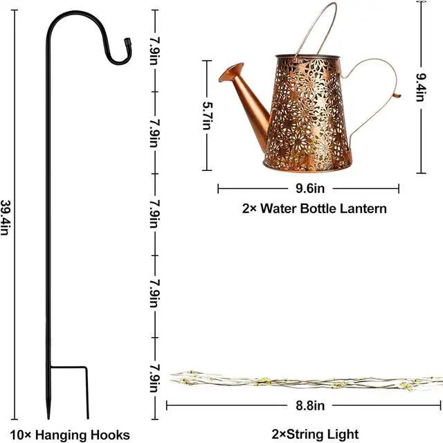 Easy Installation & Adjustable Height: Includes a 39.4 -inch shepherd' s hook (stand included), watering can light fixture, and 6 LED string lights for versatile placement in gardens, trees, or walkways. Features quick, tool-free assembly.