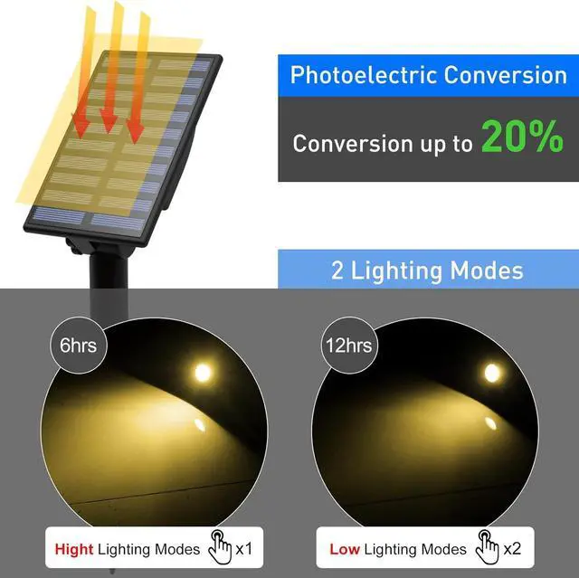 2 Mode & 2 Types of Installation The solar spot lights have High and Low light modes, high light continuously last for 8 hours and low light for 12 hours. The solar lights can be easily inserted into the ground or mounted on the wall with included accessories, making them convenient to install and use.