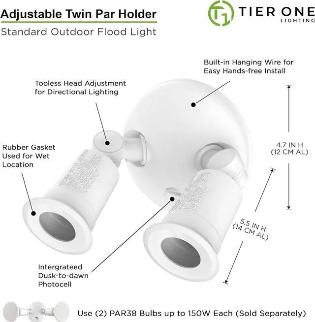 Two Head Par Light Holder - Use (2) PAR38 Bulbs up to 150W Each (Bulbs sold separately), Ideal for walkways, patios, and play areas creating an inviting exterior space as well as providing safety and security.